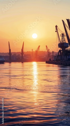© Tetiana, Fototapeta premium Cargo ships in the port at sunset. Industrial landscape, panoramic view. 3D rendering.
