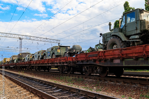 © olyasolodenko, Naklejka premium Cargo train carrying military vehicles on railway flat wagons
