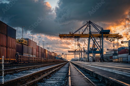 © designermetin, Naklejka premium Cargo train loading containers in vast port filled with cranes and infrastructure beneath a moody cloudy sunrise