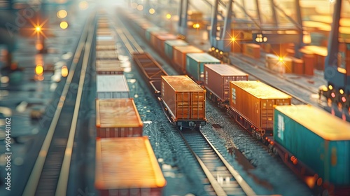 © Arieswanto, Fototapeta premium Cargo Train on Railroad Tracks at Sunset