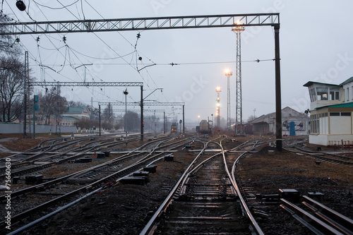 © Andrii, Obraz premium Cargo train platform at sunset with container