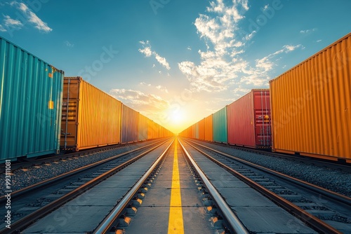 Fototapeta premium Cargo Train Tracks Vanishing into Sunset