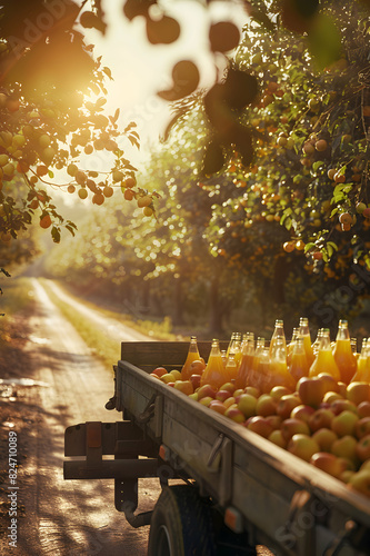 Fototapeta premium Cargo truck carrying bottles with apple juice in an orchard with sunset. Concept of food and drink production, transportation, cargo and shipping.