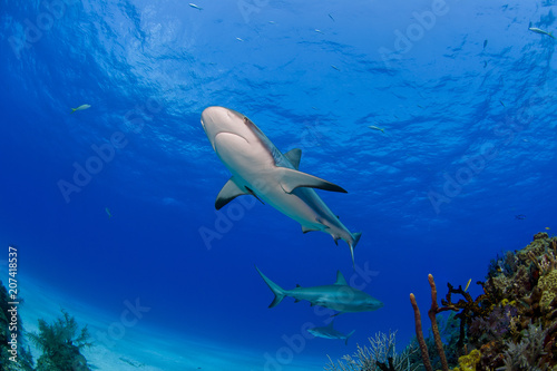 Fototapeta premium Caribbean Reef Shark bottom view above colorful coral reef in blue water