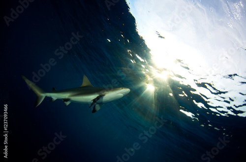 © Maydel, Fototapeta premium Caribbean Reef Shark juvenile with the head close to the surface
