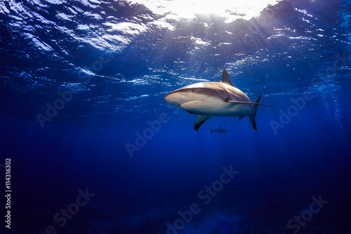Obraz premium Caribbean reef shark swimming under the surface with sunbeams an