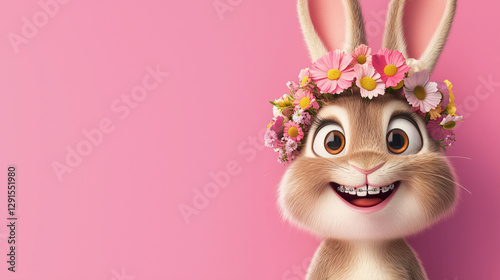 Naklejka premium caricature of a cute Easter bunny with a floral headband and dental braces...