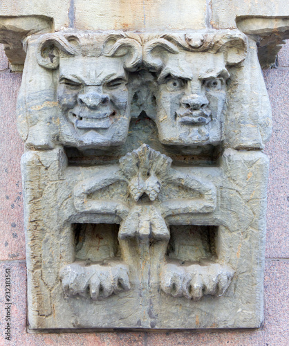 © Mauro Carli, Fototapeta premium Caricature Wall Sculpture Depicting Two Faces With Different Expressions