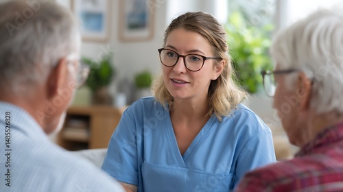 Obraz premium Caring conversation between a nurse and two elderly people.