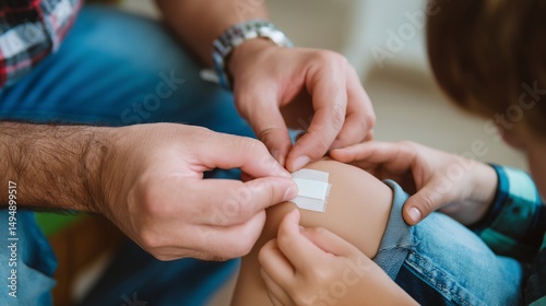 © fotofabrika, Obraz premium Caring for a scraped knee with a bandage in a warm indoor setting during the day