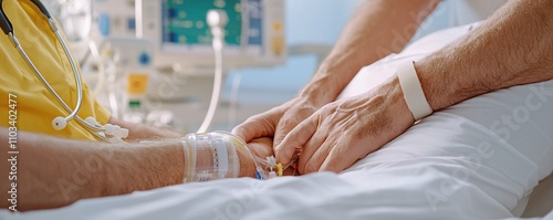 Fototapeta premium Caring hands connect in a hospital setting, symbolizing support and compassion.
