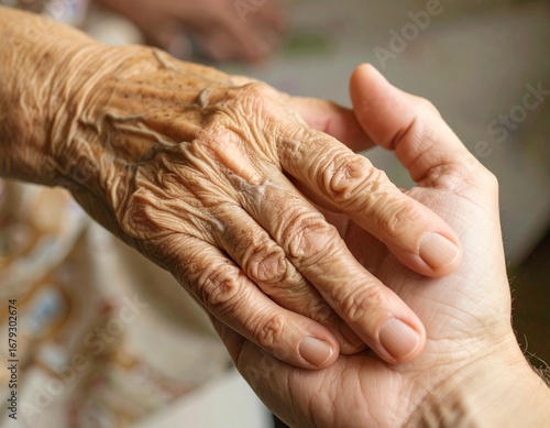 Fototapeta premium Caring nurse holds elderly patient's arthritic hand offering comfort in hospice home