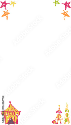 Fototapeta premium Carnival border is showing colorful stars, striped tent, clown performers, transparent background