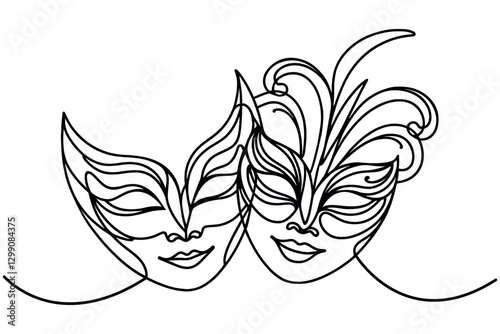© YanaBerezh, Naklejka premium Carnival feather masks single line art drawing. Black and white elegant modern vector design element isolated