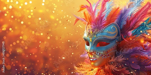 Fototapeta premium Carnival Mask with Feathers and Glittering Bokeh Background