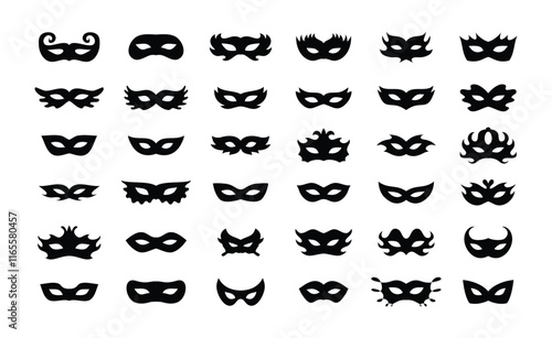 © Yanka, Naklejka premium Carnival masks silhouettes icon set. Simple black icons masquerade mask, for party, parad, carnival, Halloween. Mask elements isolated sign, symbol