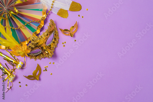 Fototapeta premium Carnival or mardi gras concept with golden carnival masks and party decorations on purple background. Top view, flat lay