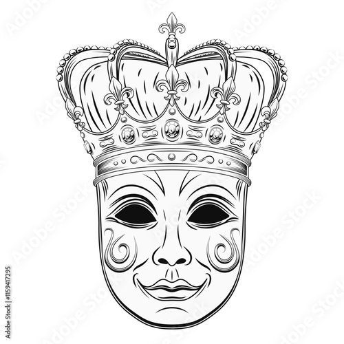 Naklejka premium Carnival venetian face mask with imperial crown with gemstones, pearls, fleur de lis sign on points. Detailed illustration in vintage style. Front view.