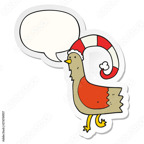 © lineartestpilot, Naklejka premium caroton chicken in funny christmas hat and speech bubble sticker