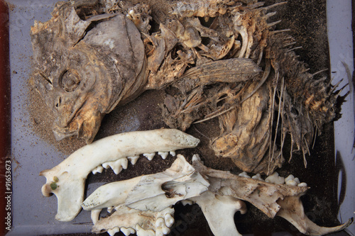 © jonnysek, Naklejka premium carp fish and pig head skeleton