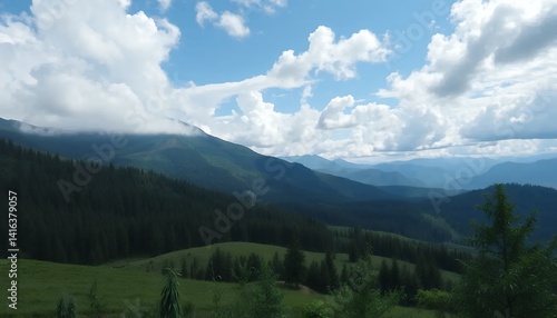 © Murs, Obraz premium Carpathian Mountains Vista: Rolling Hills and Cloud-Veiled Peaks under a Summer Sky