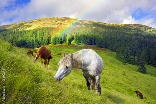 © panaramka, Fototapeta premium Carpathian mustangs in Gorgany