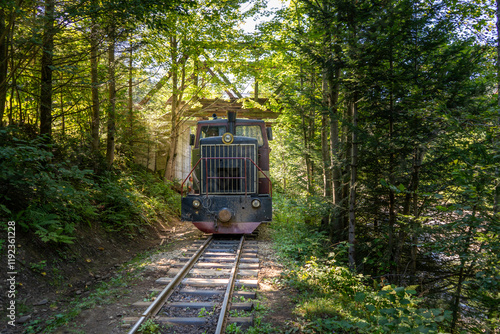 © Real_life, Fototapeta premium Carpathian tram. Steam locomotive on a narrow-gauge railway. Old transport in the forest nature