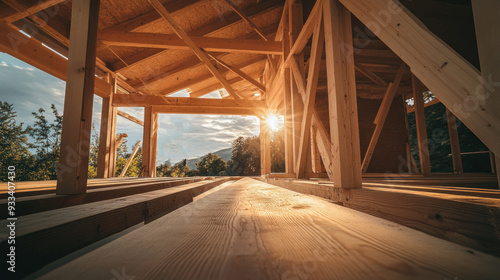 Fototapeta premium Carpenter building a wooden frame for a house, with beams and support structures visible