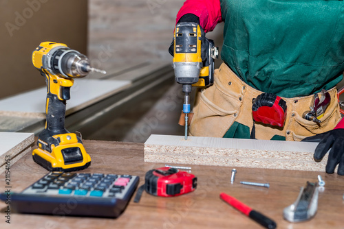 © RomanR, Obraz premium Carpenter with screwdriver constructing furniture in carpentry