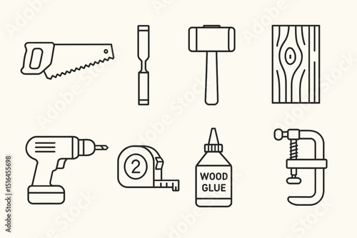 Fototapeta premium Carpentry tools: saw, chisel, mallet, wood, drill, tape, glue, clamp