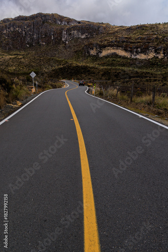 © daniel, Naklejka premium Carretera de montaña con línea amarilla sinuosa, atravesando el paisaje de páramo andino y acantilados rocosos bajo un cielo nublado, con un vehículo en la distancia.