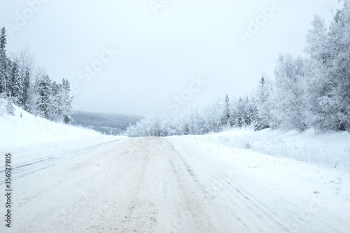 Fototapeta premium CARRETERA NEVADA RODEADA DE PINOS