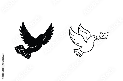 Obraz premium Carrier Pigeon, Messenger Bird, Delivery, Mail, Message, Icon, Symbol, Black, White, Graphics
