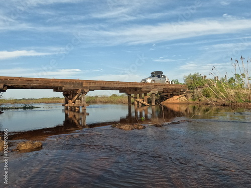 © carina furlanetto, Naklejka premium carro em ponte de madeira na estrada parque pantanal no mato grosso dos ul