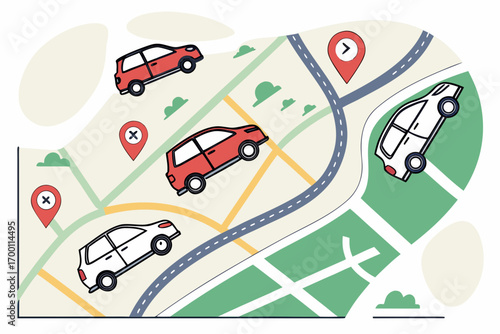 © Ayaat, Naklejka premium Cars navigating a stylized city map with location pins