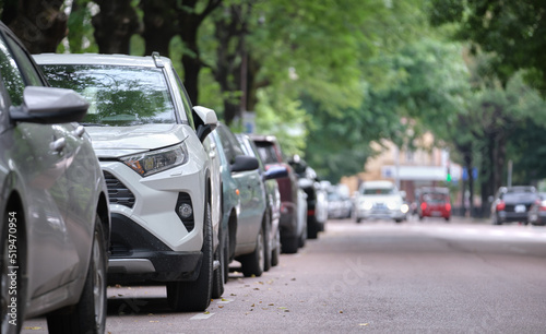 © bilanol, Fototapeta premium Cars parked in line on city street side. Urban traffic concept