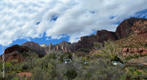 © JMP Traveler, Fototapeta premium Cars parked in Zion National Park Utah, with the three kings cliffs in background.
