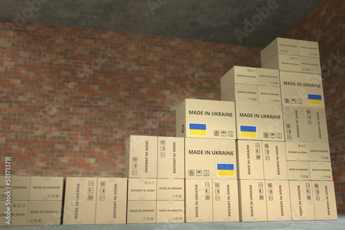 © Alexey Novikov, Fototapeta premium Cartons with MADE IN UKRAINE text compose a rising chart, business success related conceptual 3D rendering