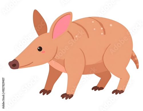 © Carjo, Fototapeta premium Cartoon aardvark, tan with pink ears, standing, side view on white background, with brown paws and sparse polka dots