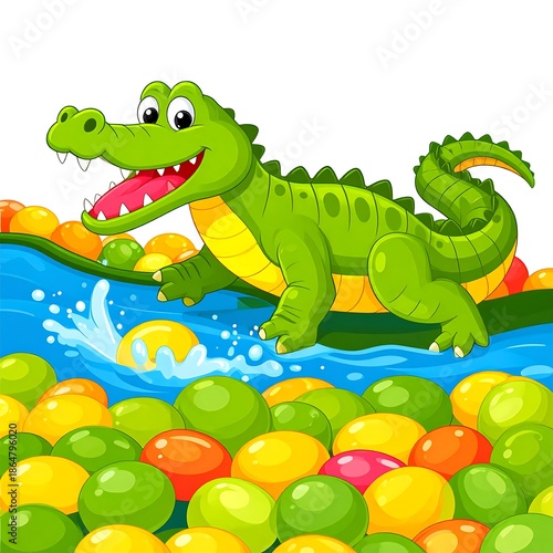 © Duit, Fototapeta premium Cartoon alligator splashing in water, surrounded by colorful floating objects