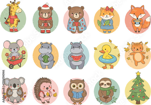 © Shafiqul, Naklejka premium Cartoon animal character set, cute wildlife icons, seasonal illustration, pastel background, kids clipart, giraffe bear fox duck owl tree
