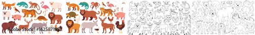 Obraz premium Cartoon Animal Collection Featuring Lion, Tiger, Monkey, Bird, Bear and Sketches for Coloring Book