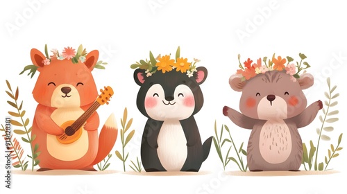 Naklejka premium Cartoon animals enjoying a spring festival with flower crowns music and dancing