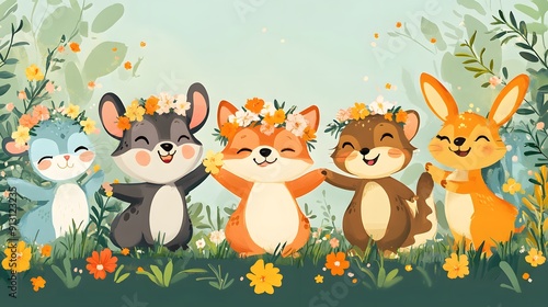 Naklejka premium Cartoon animals enjoying a spring festival with flower crowns music and dancing