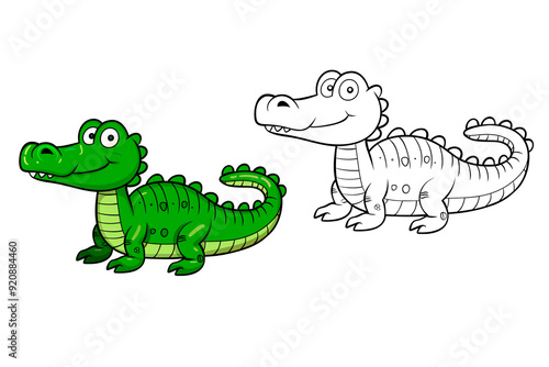© AGSOL, Obraz premium Cartoon animals, funny drawn crocodile with contour lines isolated on a transparent background. Simple animal Clip Art, Printable crocodile Coloring Page. Simple coloring book for children.