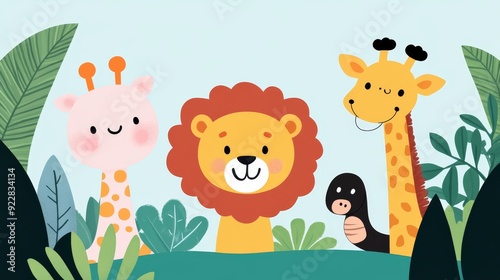 Naklejka premium Cartoon animals in a jungle with a playful lion, giggling giraffe, and sneaky...