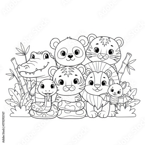 © ikk, Naklejka premium Cartoon animals in black and white tiger panda snake alligator and friends