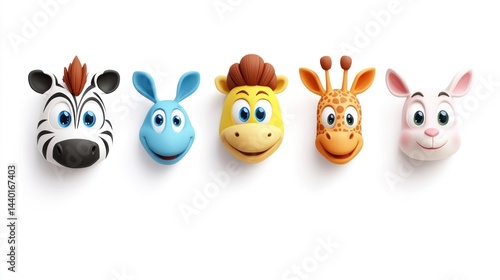 © Mufarokah, Naklejka premium Cartoon animals Zebra, donkey, horse, giraffe, rabbit lined up against a bright background, playful