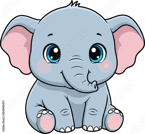Naklejka premium Cartoon baby elephant sitting, cute animal, big blue eyes, pink ears,...