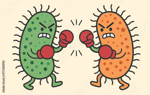 Fototapeta premium Cartoon Bacteria Boxing Duel Between Green and Orange Microbes, Humorous Health Illustration